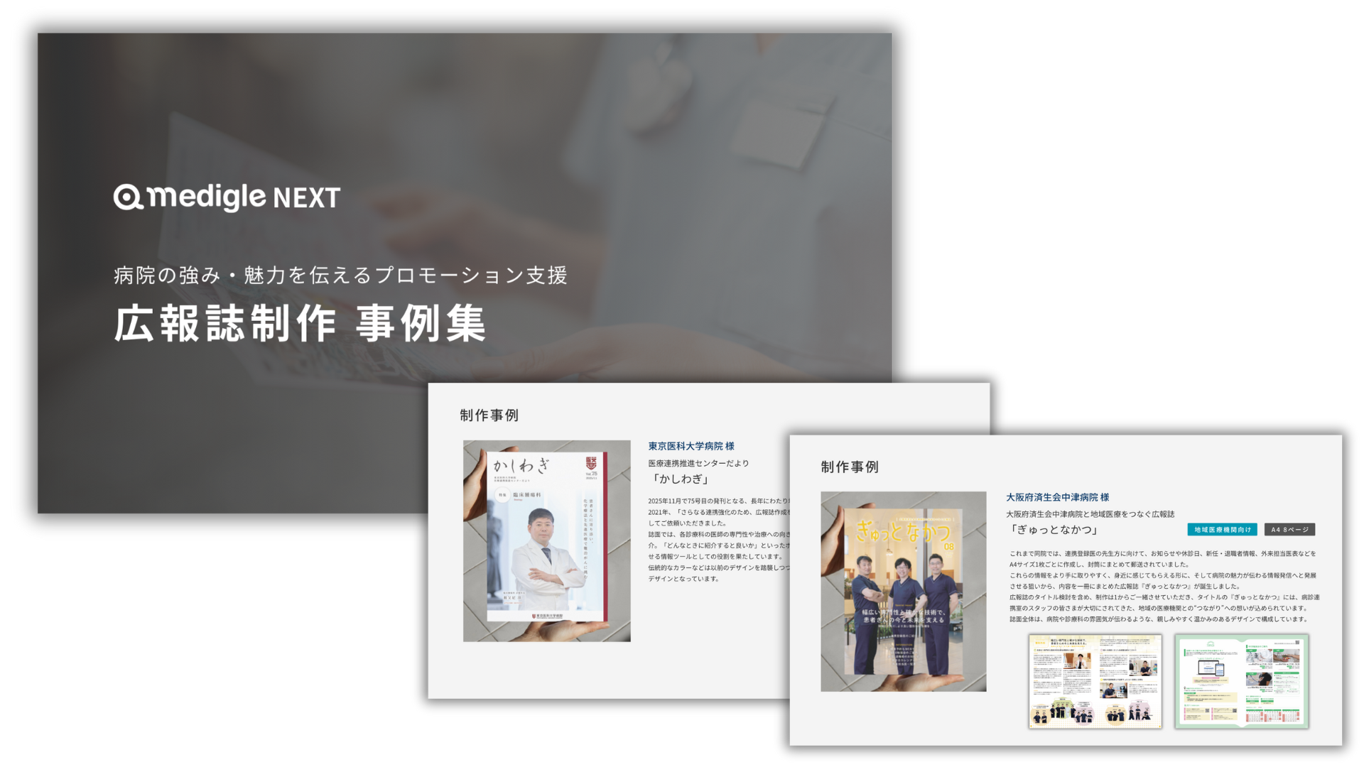 メディグルNEXTにて手がけた各病院様の広報誌制作事例を紹介します。